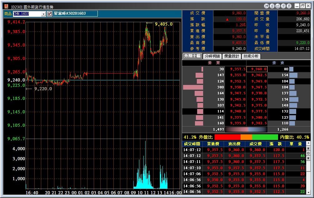 功能說明:列出國外期貨商品報價、最佳買賣五檔、分時明細及選擇權走勢、大盤指數等相關資訊頁籤,方便使用者切換瀏覽。