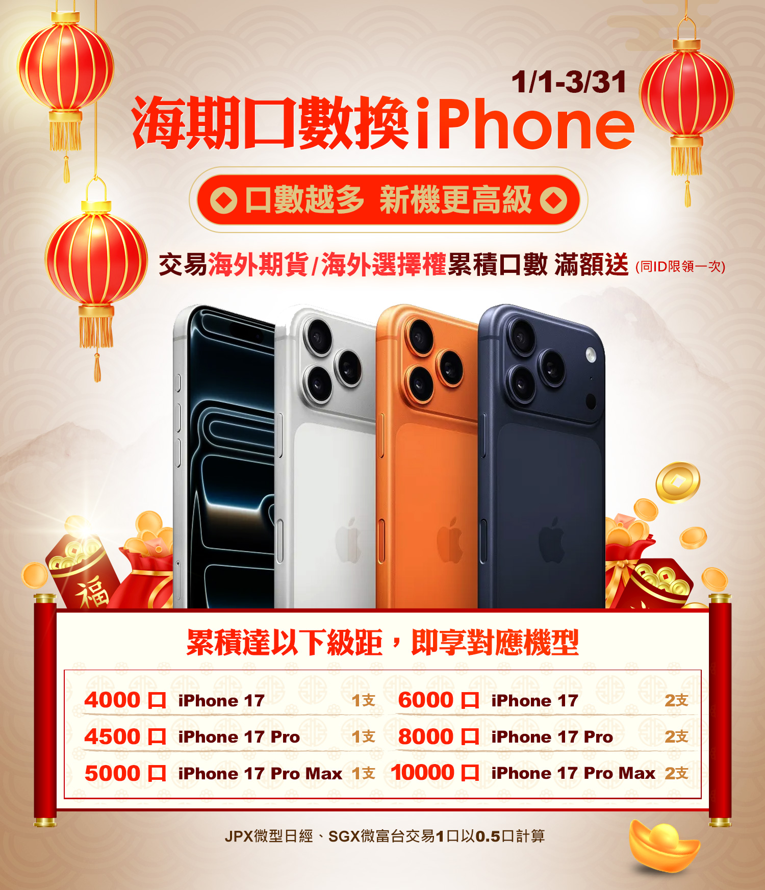 3. 海期交易贈iPhone活動贈獎說明,JPX微型日經1口以0.5口計算,依同ID最終交易海期累計口數達到最高區間領獎。