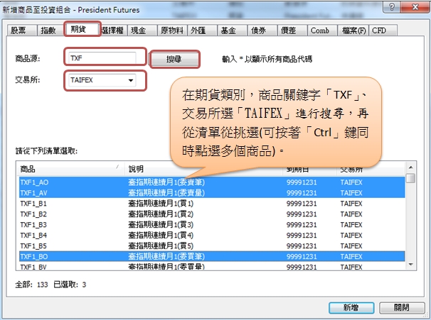 MC把委買張、委賣張、委買筆、委賣筆等資訊當成獨立商品提供報價,所以我們要先去QM裡新增上述商品。打開QM>商品>新增商品>從數據源取得>Presidet Futures。如下圖所示: