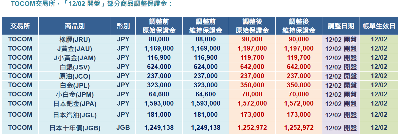 OSE、TCE交易所,「12/02」部分商品調整保證金