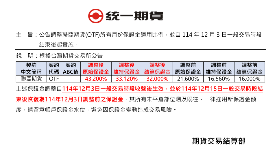 保證金調整通知 【公告】調整聯亞期貨(OTF)所有月份保證金適用比例,並自114年12月3日一般交易時段結束後起實施。 發表時間:2025.12.02 主 旨:公告調整聯亞期貨(OTF)所有月份保證金適用比例,並自114年12月3日一般交易時段結束後起實施。 回列表