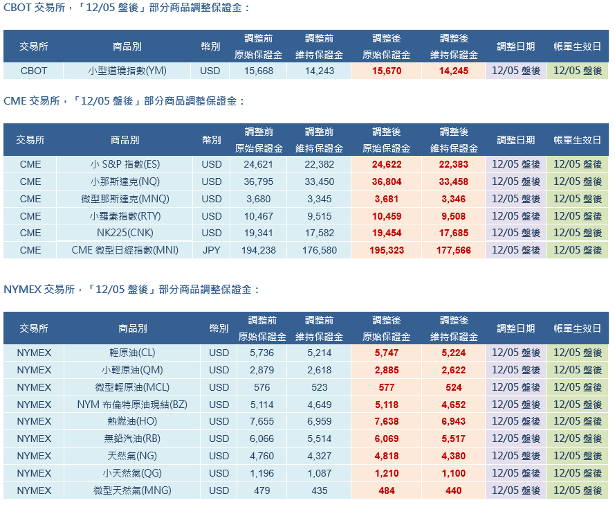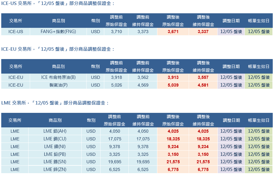 CBOT、CME、NYMEX、ICE-US、ICE-EU、LME 交易所「12/05盤後」部分商品調整保證金