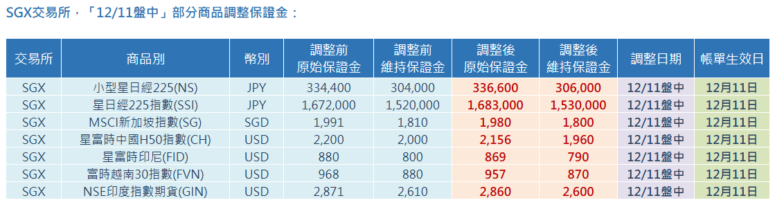 SGX交易所,「12/11盤中」部分商品調整保證金