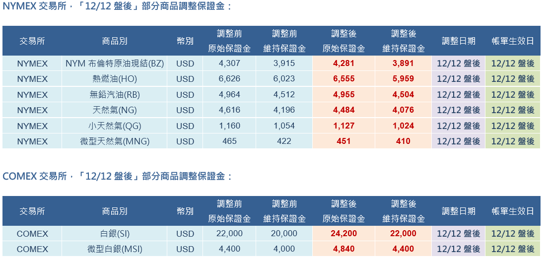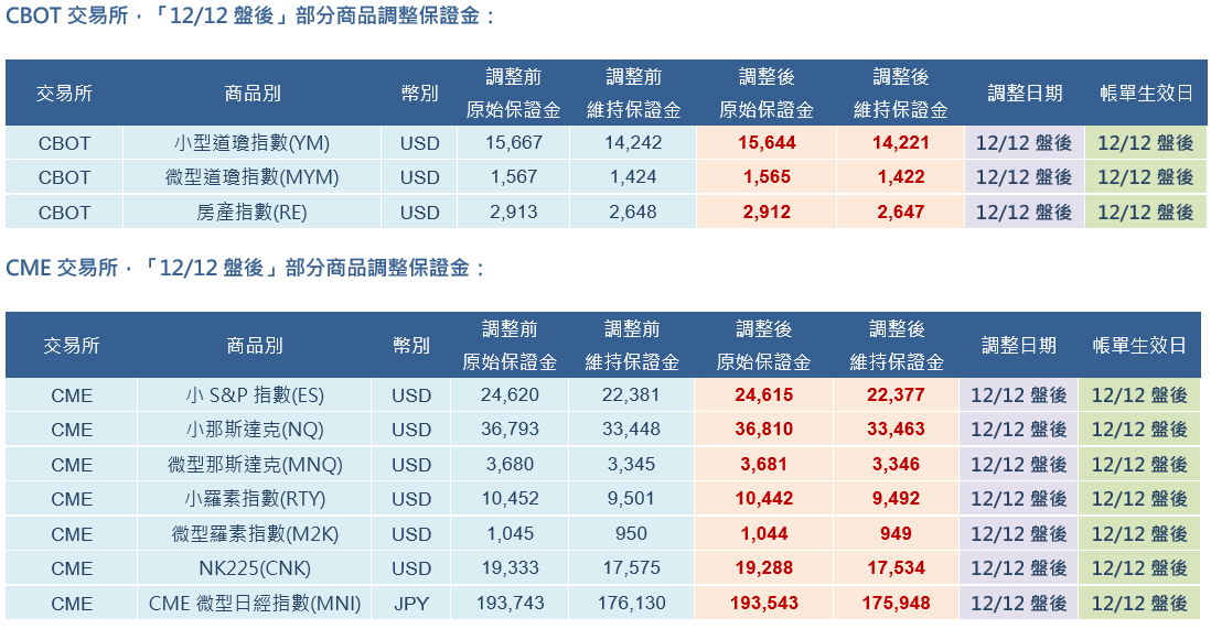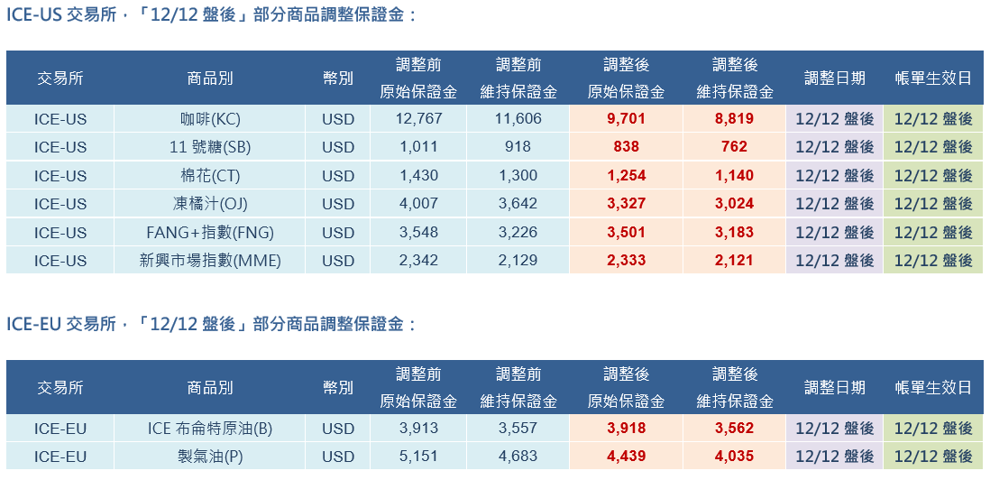 CBOT、CME、NYMEX、ICE-US、ICE-EU 交易所「12/12盤後」部分商品調整保證金