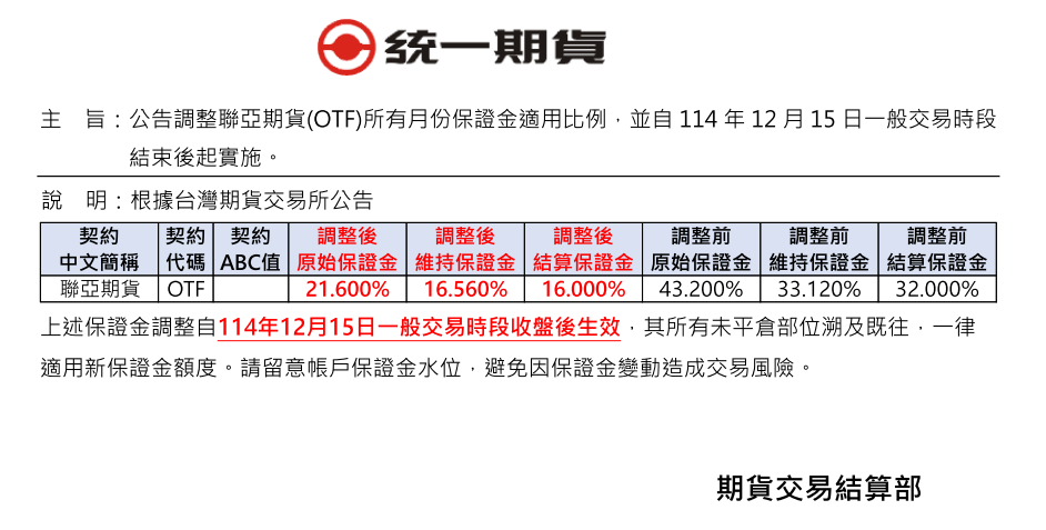 保證金調整通知 【公告】調整聯亞期貨(OTF)所有月份保證金適用比例,並自114年12月15日一般交易時段結束後起實施。 發表時間:2025.12.12 主 旨:公告調整聯亞期貨(OTF)所有月份保證金適用比例,並自114年12月15日一般交易時段結束後起實施。 回列表