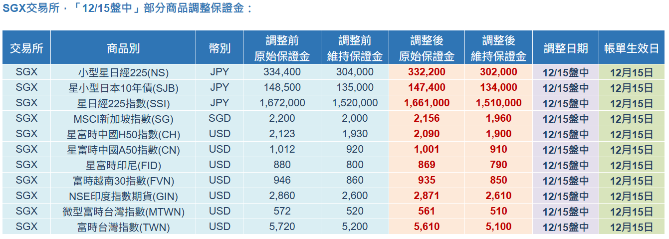 SGX交易所,「12/15盤中」部分商品調整保證金
