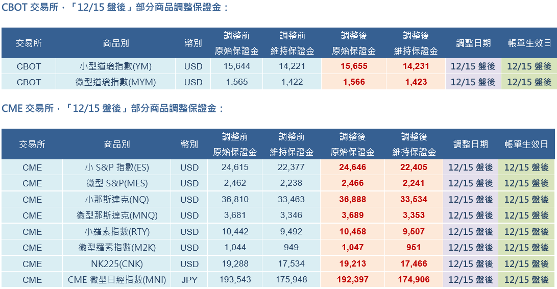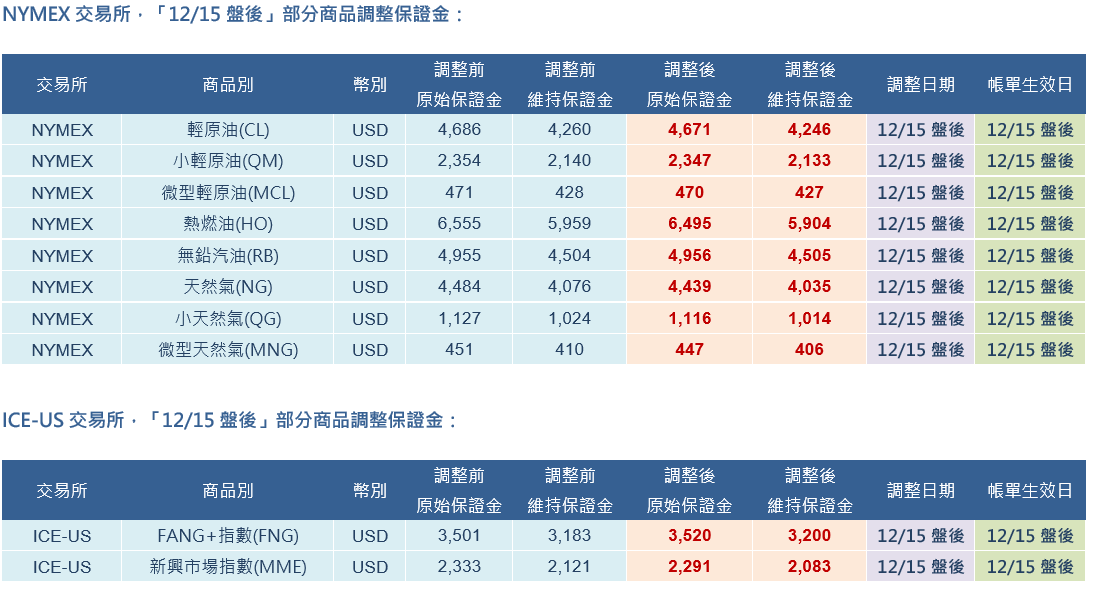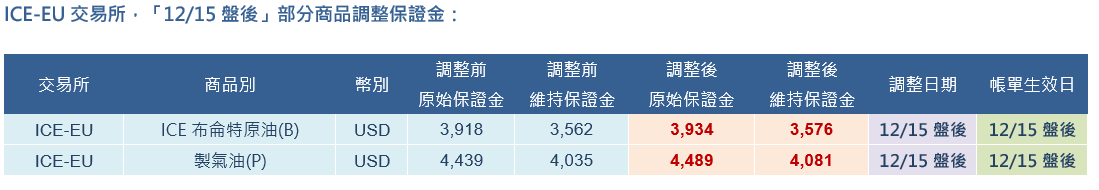 CBOT、CME、NYMEX、ICE-US、ICE-EU 交易所「12/15盤後」部分商品調整保證金
