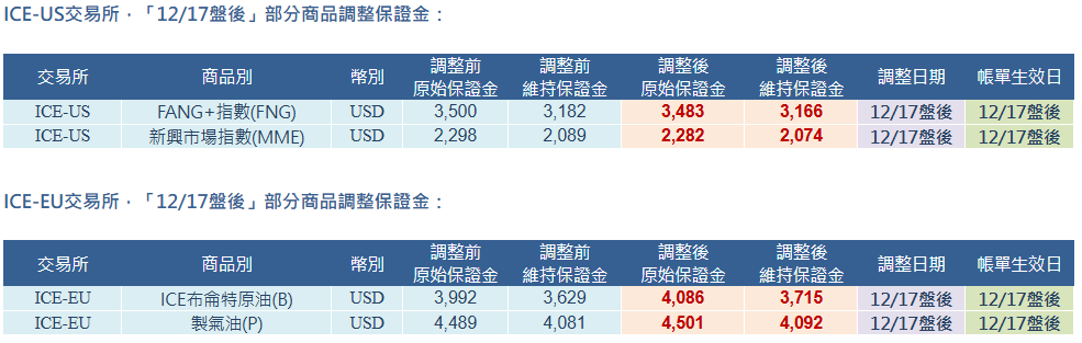 CBOT、CME、NYMEX、ICE-US、ICE-EU 交易所「12/17盤後」部分商品調整保證金