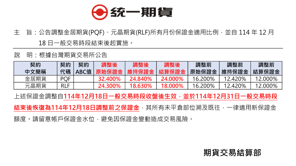 保證金調整通知 【公告】調整金居期貨(PQF)、元晶期貨(RLF)所有月份保證金適用比例,並自114年12月18日一般交易時段結束後起實施。 發表時間:2025.12.17 主 旨:公告調整金居期貨(PQF)、元晶期貨(RLF)所有月份保證金適用比例,並自114年12月18日一般交易時段結束後起實施。 回列表