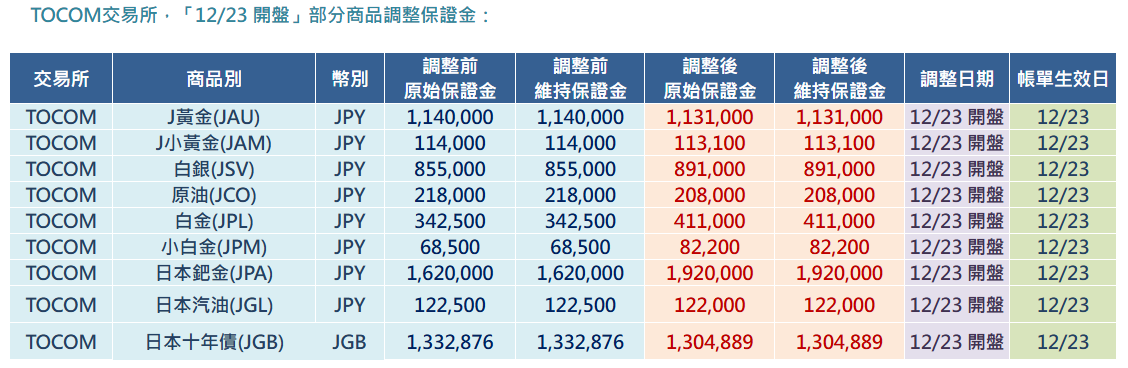 TOCOM交易所,「12/23 開盤」部分商品調整保證金