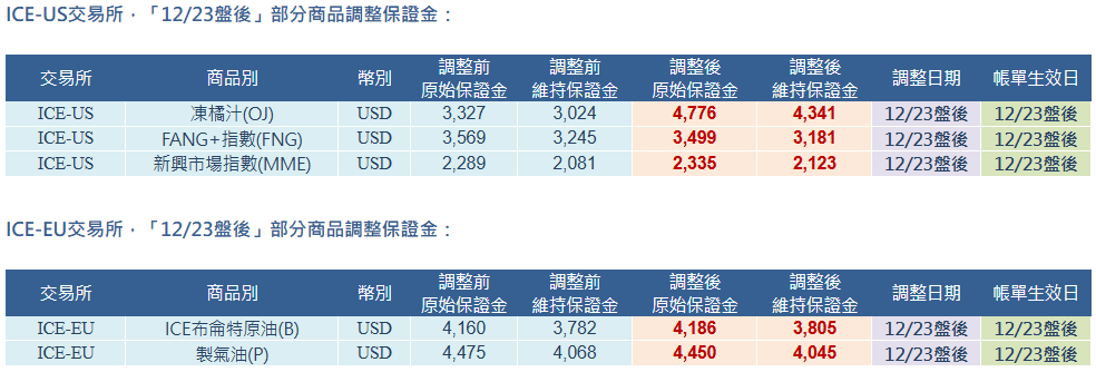 CBOT、CME、NYMEX、ICE-US、ICE-EU 交易所「12/23盤後」部分商品調整保證金