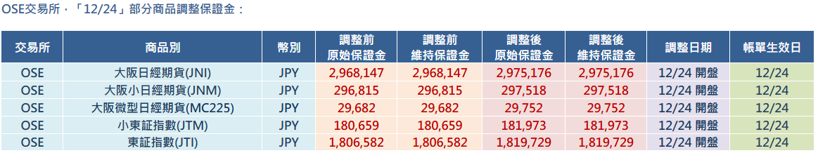 OSE交易所,「12/24」部分商品調整保證金