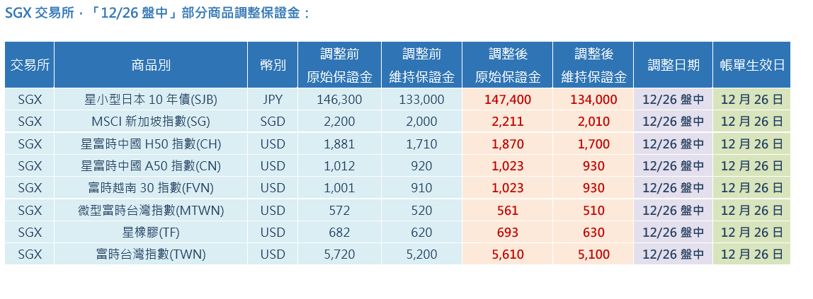 SGX交易所,「12/26盤中」部分商品調整保證金