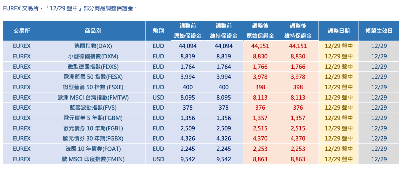 EUREX交易所,「12/29 盤中」部分商品調整保證金