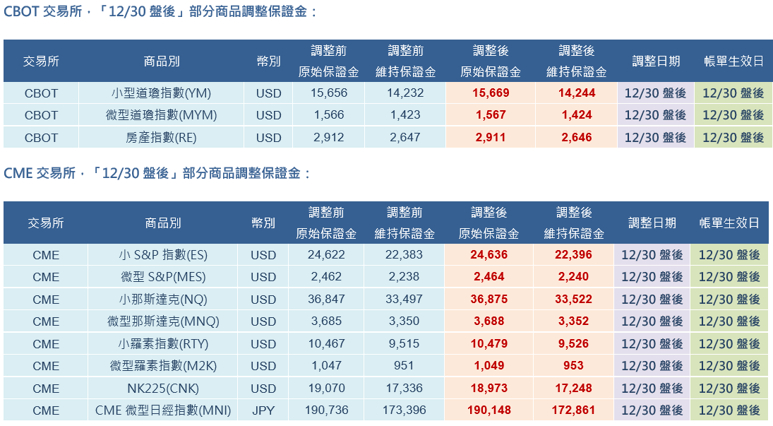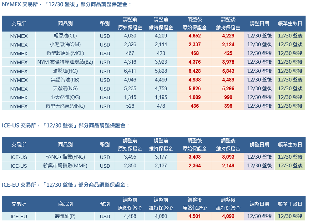 CBOT、CME、NYMEX、ICE-US、ICE-EU 交易所「12/30盤後」部分商品調整保證金