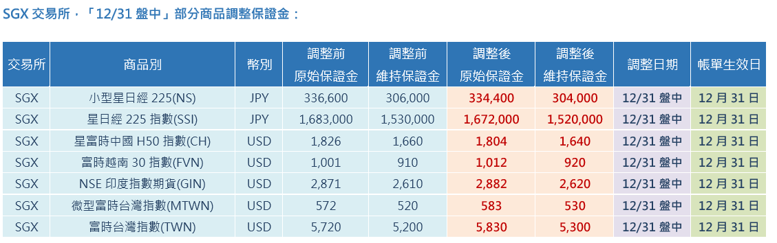 SGX交易所,「12/31盤中」部分商品調整保證金