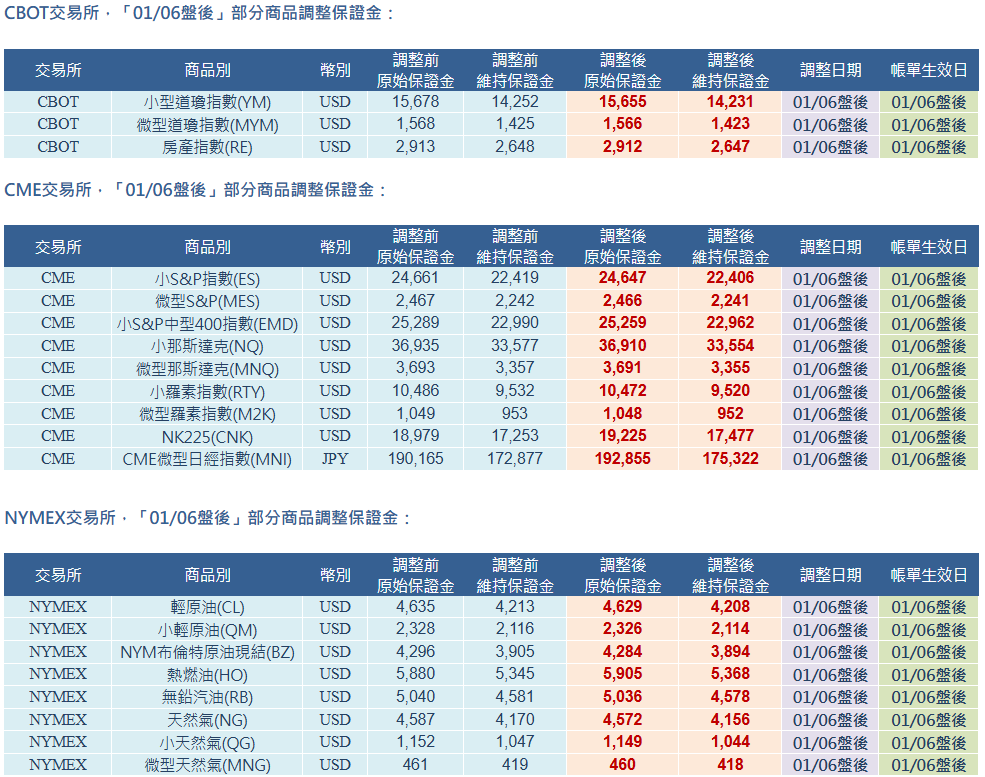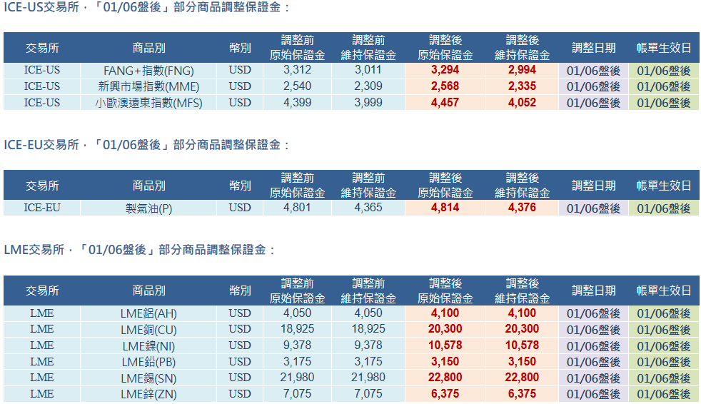 CBOT、CME、NYMEX、ICE-US、ICE-EU、LME 交易所「01/06盤後」部分商品調整保證金