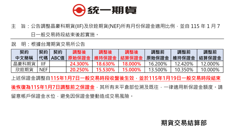保證金調整通知 【公告】調整晶豪科期貨(IIF)及欣銓期貨(NEF)所有月份保證金適用比例,並自115年1月7日一般交易時段結束後起實施。 發表時間:2026.01.06 主 旨:公告調整晶豪科期貨(IIF)及欣銓期貨(NEF)所有月份保證金適用比例,並自115年1月7日一般交易時段結束後起實施。 回列表