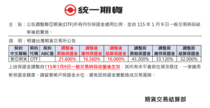 保證金調整通知 【公告】調整聯亞期貨(OTF)所有月份保證金適用比例,並自115年1月9日一般交易時段結束後起實施。 發表時間:2026.01.08 主 旨:公告調整聯亞期貨(OTF)所有月份保證金適用比例,並自115年1月9日一般交易時段結束後起實施。 回列表