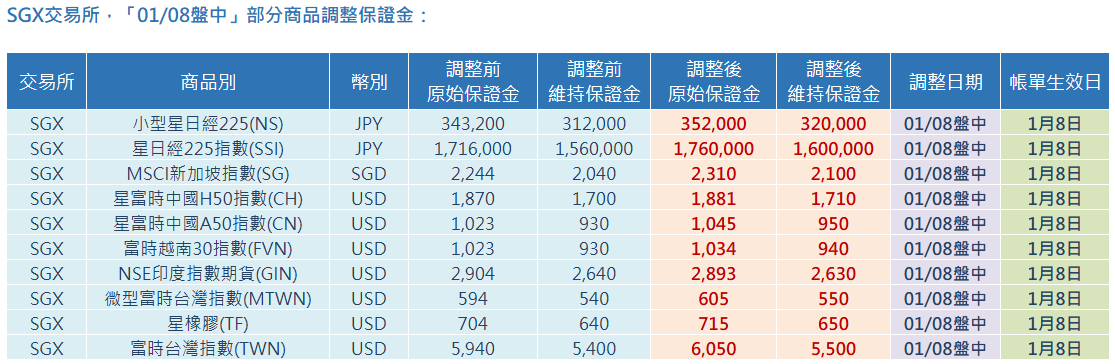 SGX交易所,「01/08盤中」部分商品調整保證金