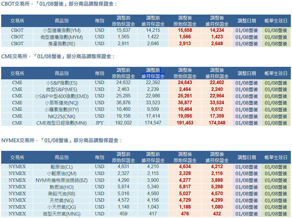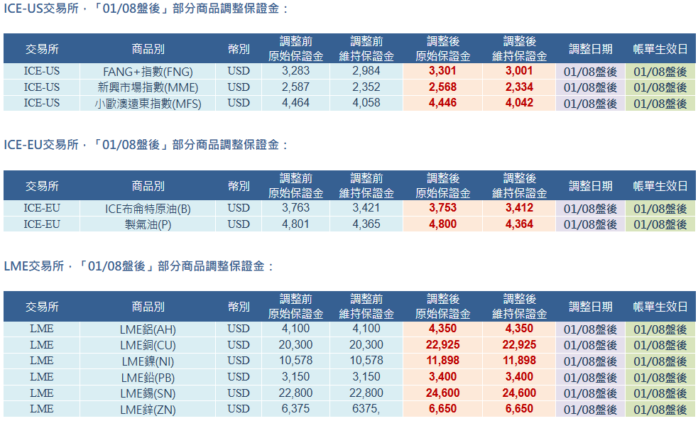 CBOT、CME、NYMEX、ICE-US、ICE-EU、LME 交易所「01/08盤後」部分商品調整保證金