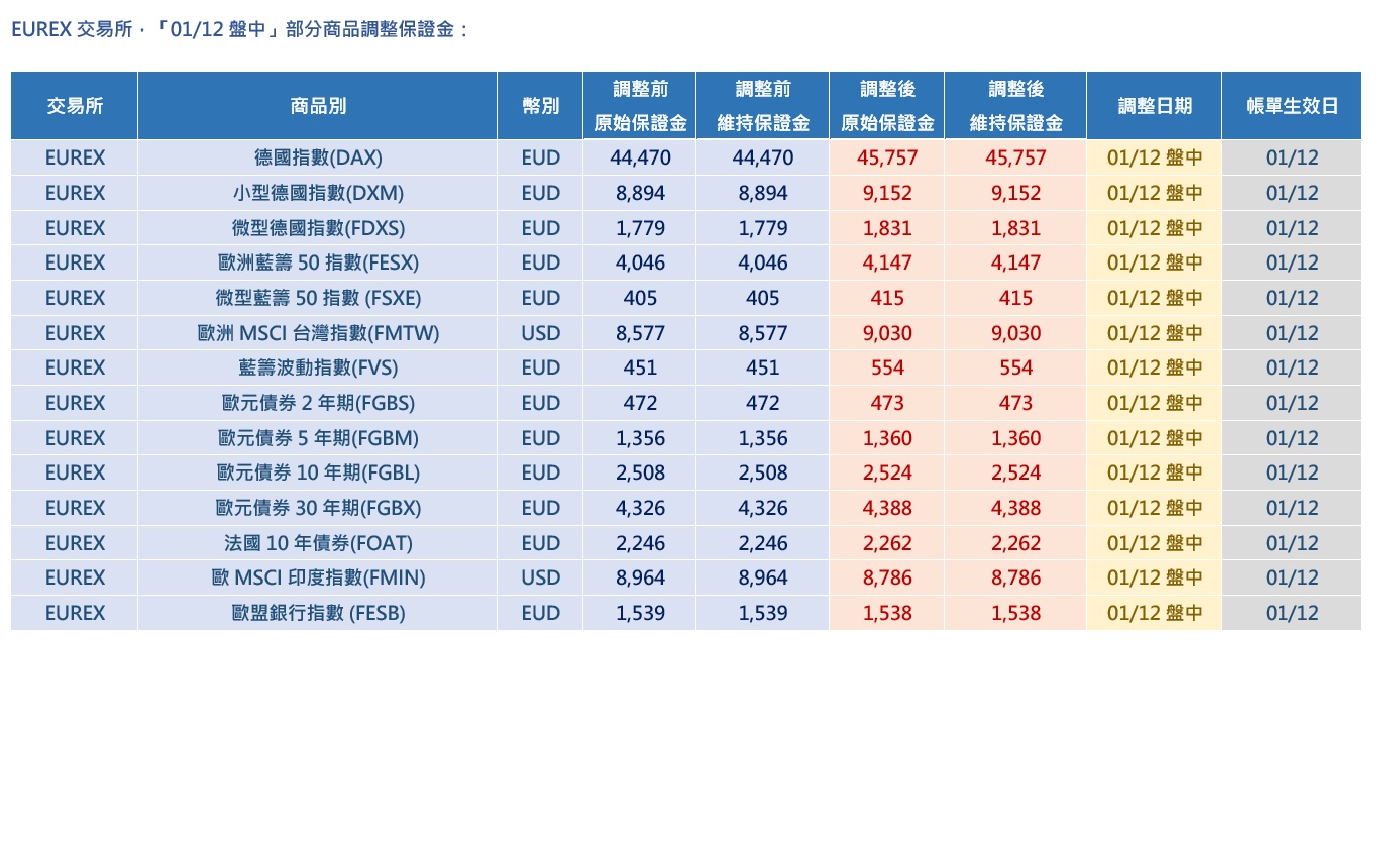 EUREX交易所,「01/12 盤中」部分商品調整保證金