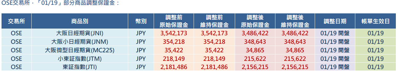 OSE交易所,「01/19」部分商品調整保證金