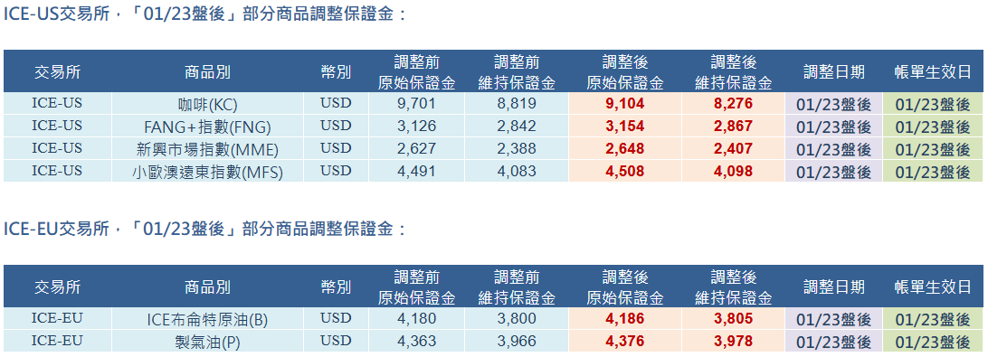 CBOT、CME、NYMEX、COMEX、ICE-US、ICE-EU 交易所「01/23盤後」部分商品調整保證金
