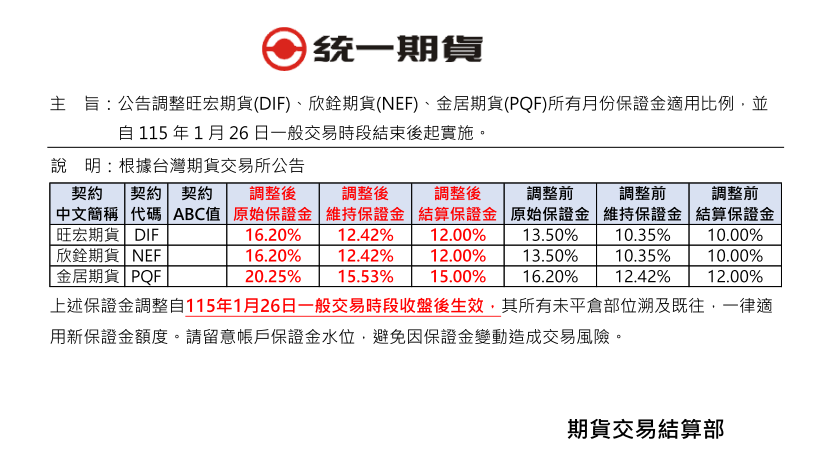 保證金調整通知 【公告】調整旺宏期貨(DIF)、欣銓期貨(NEF)、金居期貨(PQF)所有月份保證金適用比例,並自115年1月26日一般交易時段結束後起實施。 發表時間:2026.01.23 主 旨:公告調整旺宏期貨(DIF)、欣銓期貨(NEF)、金居期貨(PQF)所有月份保證金適用比例,並自115年1月26日一般交易時段結束後起實施。 回列表