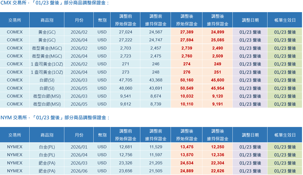 NYMEX、COMEX 交易所「01/23盤後」部分商品調整保證金