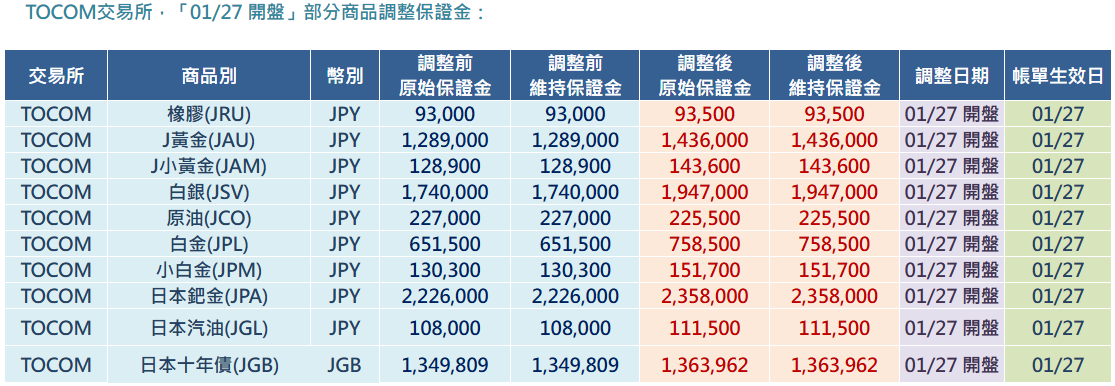 OSE、TOCOM交易所,「01/27」部分商品調整保證金