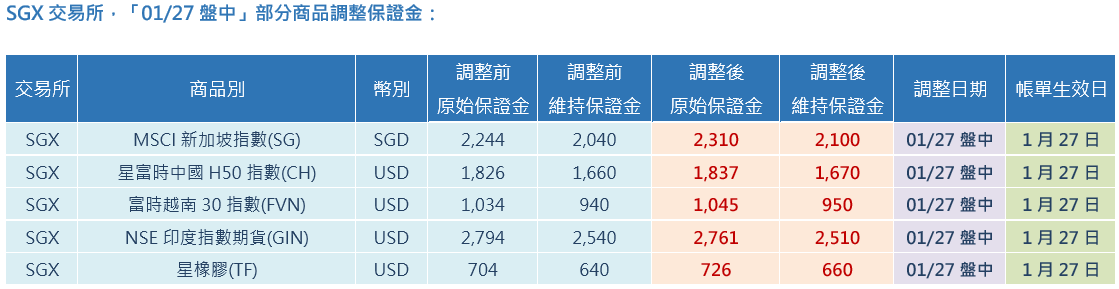 SGX交易所,「01/27盤中」部分商品調整保證金