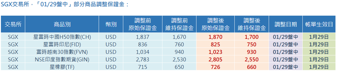 SGX交易所,「01/29盤中」部分商品調整保證金