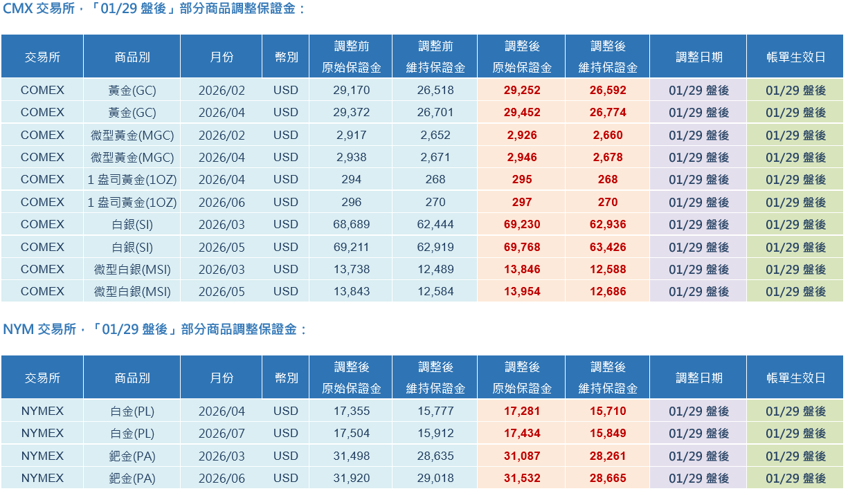 交易提醒:NYMEX、COMEX 交易所「01/29盤後」部分商品調整保證金