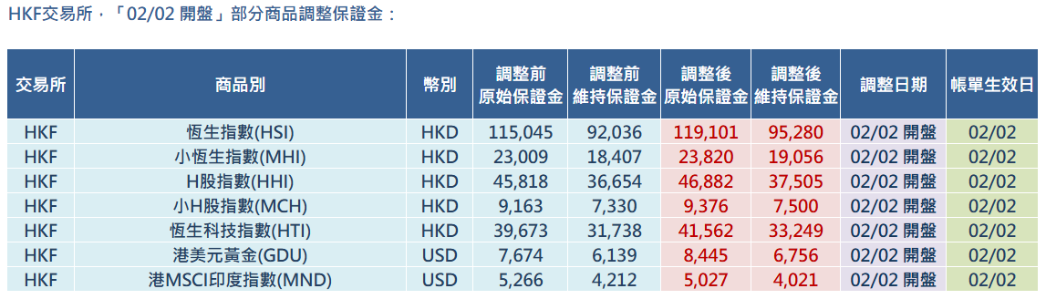HKF交易所,「02/02 開盤」部分商品調整保證金