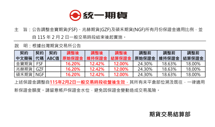 保證金調整通知 【公告】調整金寶期貨(FSF)、兆赫期貨(GZF)及碩禾期貨(NGF)所有月份保證金適用比例,並自115年2月2日一般交易時段結束後起實施。 發表時間:2026.01.30 主 旨:公告調整金寶期貨(FSF)、兆赫期貨(GZF)及碩禾期貨(NGF)所有月份保證金適用比例,並自115年2月2日一般交易時段結束後起實施。 回列表