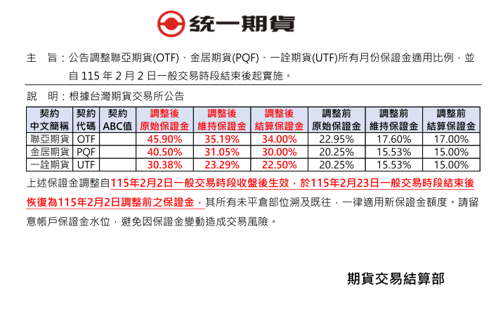 保證金調整通知 【公告】調整聯亞期貨(OTF)、金居期貨(PQF)、一詮期貨(UTF)所有月份保證金適用比例,並自115年2月2日一般交易時段結束後起實施。 發表時間:2026.01.30 主 旨:公告調整聯亞期貨(OTF)、金居期貨(PQF)、一詮期貨(UTF)所有月份保證金適用比例,並自115年2月2日一般交易時段結束後起實施。 回列表