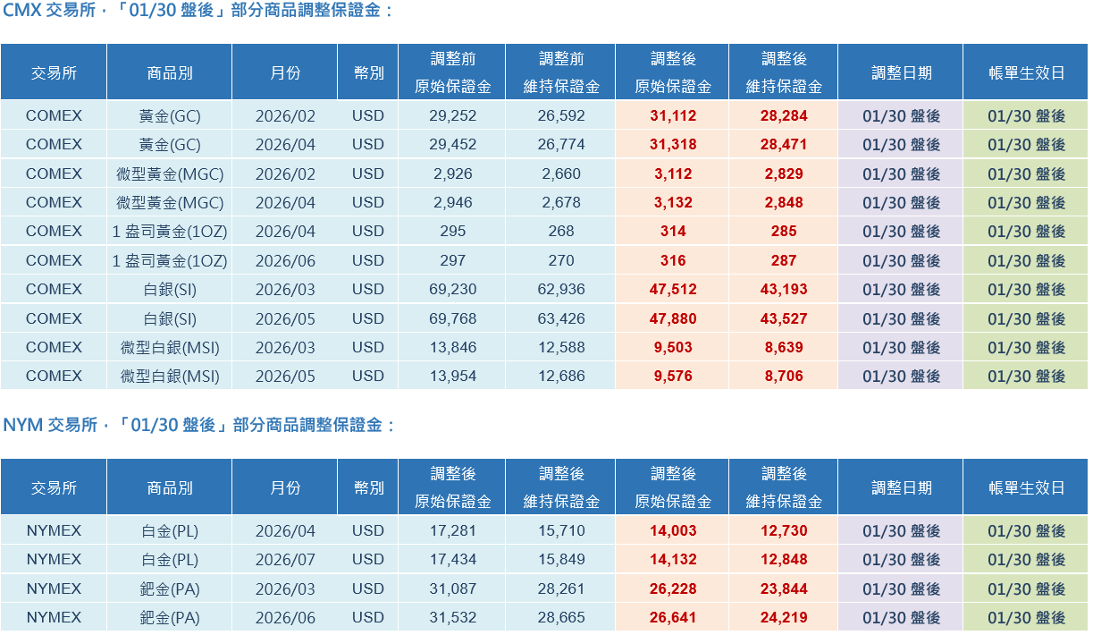 交易提醒:NYMEX、COMEX 交易所「01/30盤後」部分商品調整保證金
