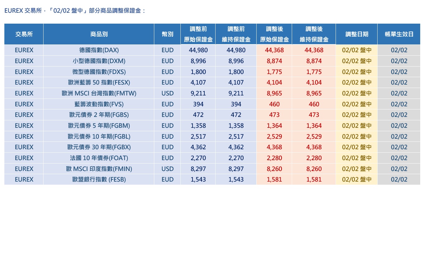 EUREX交易所,「02/02 盤中」部分商品調整保證金