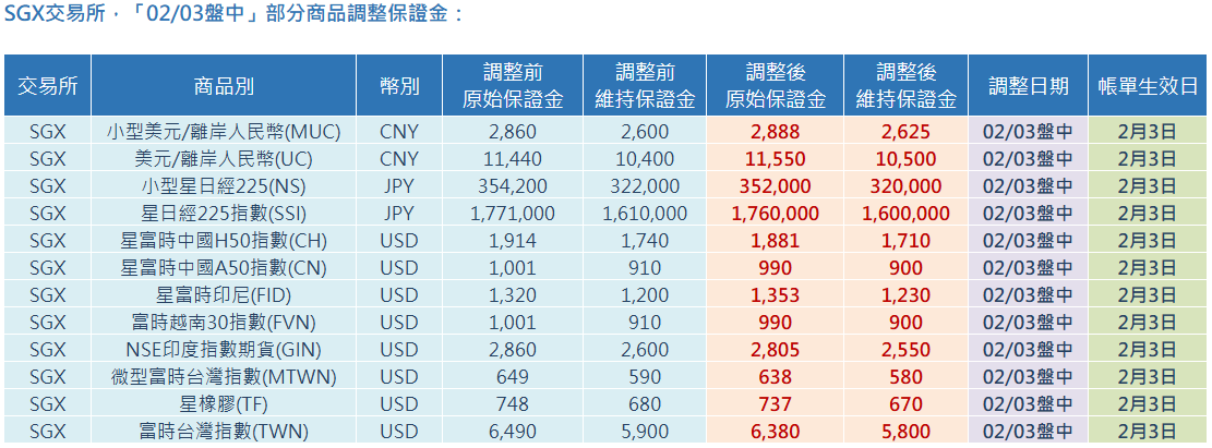 SGX交易所,「02/03盤中」部分商品調整保證金
