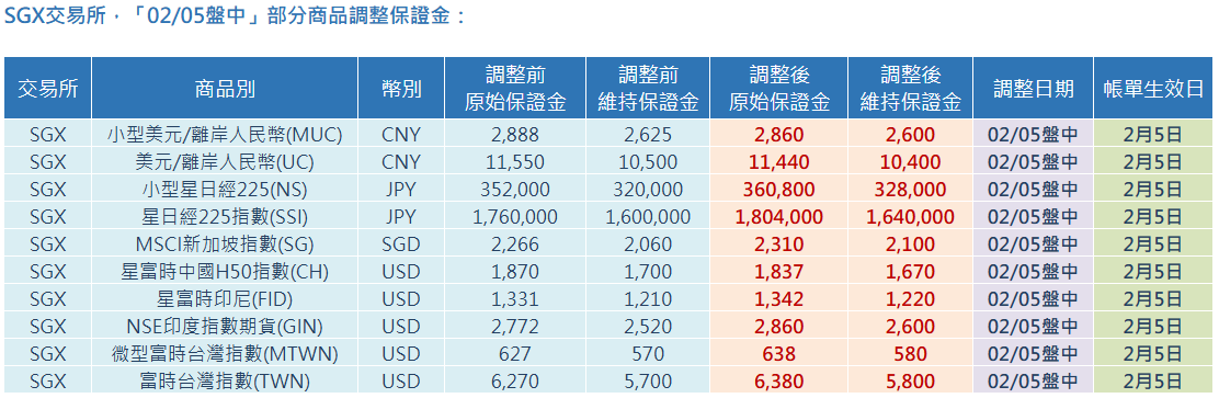 SGX交易所,「02/05盤中」部分商品調整保證金