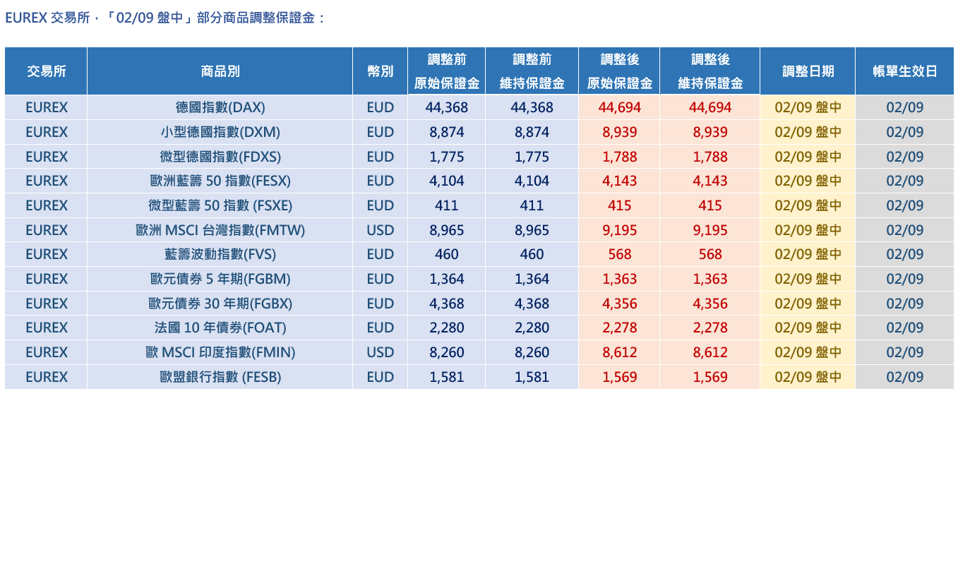 EUREX交易所,「02/09 盤中」部分商品調整保證金