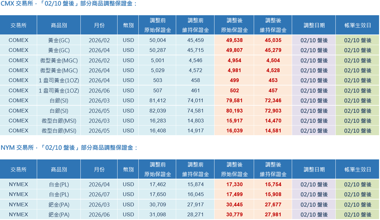 交易提醒:NYMEX、COMEX 交易所「02/10盤後」部分商品調整保證金