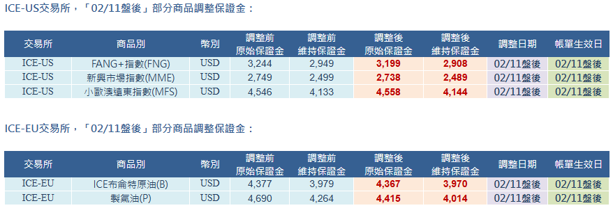 CBOT、CME、NYMEX、ICE-US、ICE-EU 交易所「02/11盤後」部分商品調整保證金