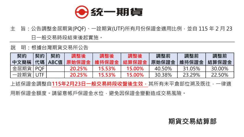 保證金調整通知 【公告】調整金居期貨(PQF)、一詮期貨(UTF)所有月份保證金適用比例,並自115年2月23日一般交易時段結束後起實施。 發表時間:2026.02.12 主 旨:公告調整金居期貨(PQF)、一詮期貨(UTF)所有月份保證金適用比例,並自115年2月23日一般交易時段結束後起實施。 回列表