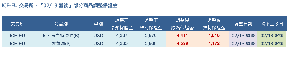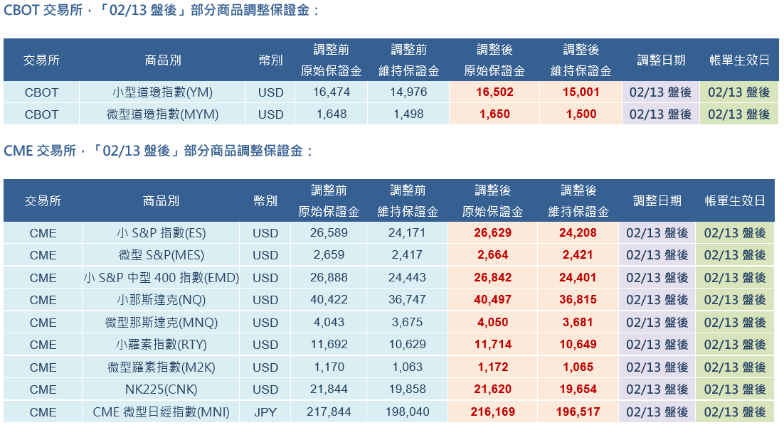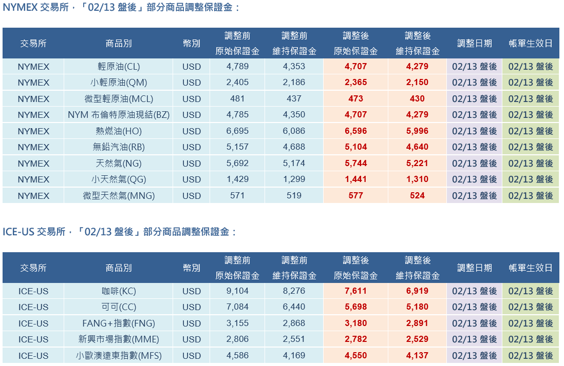 CBOT、CME、NYMEX、ICE-US、ICE-EU 交易所「02/13盤後」部分商品調整保證金