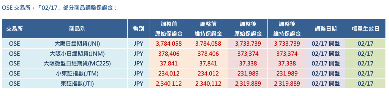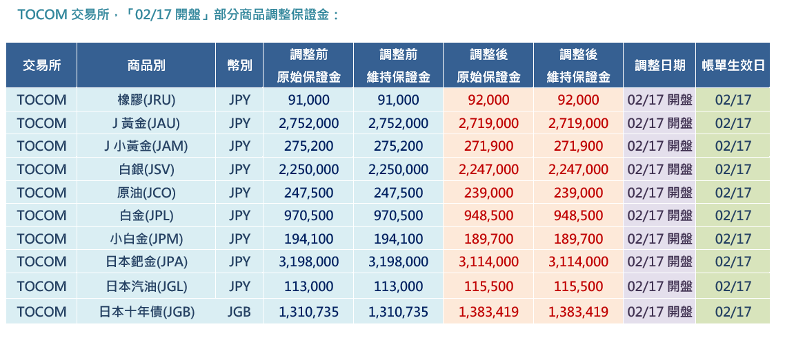 JPX交易所,「02/17」部分商品調整保證金