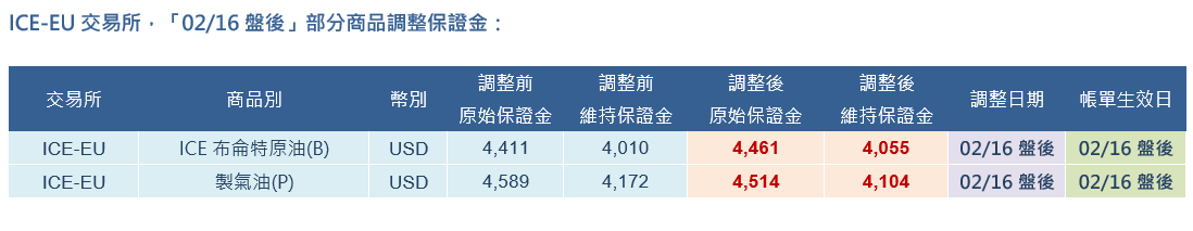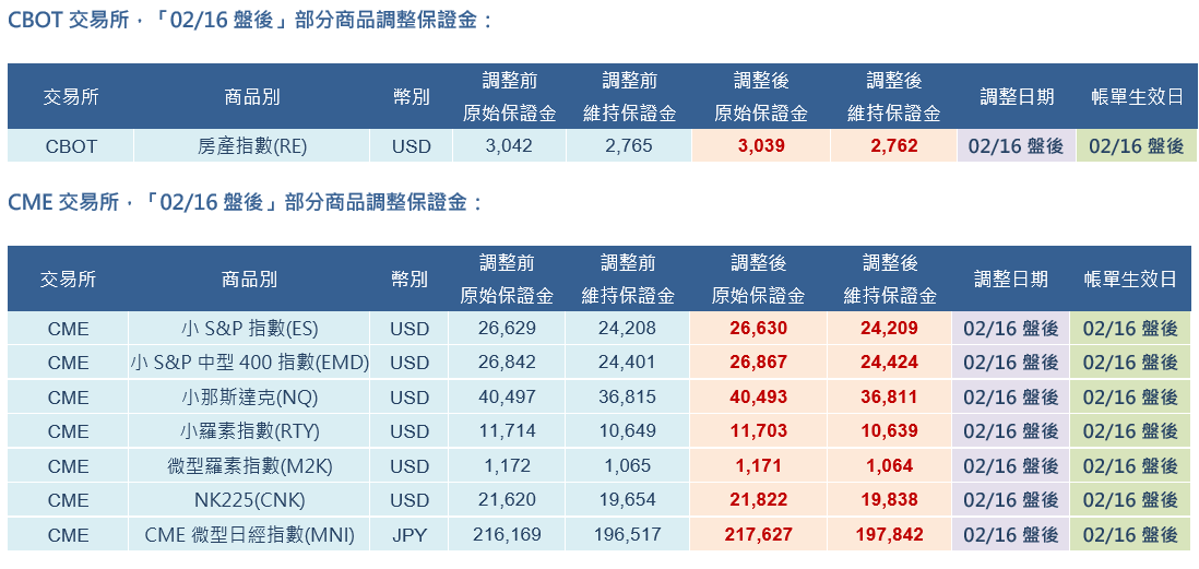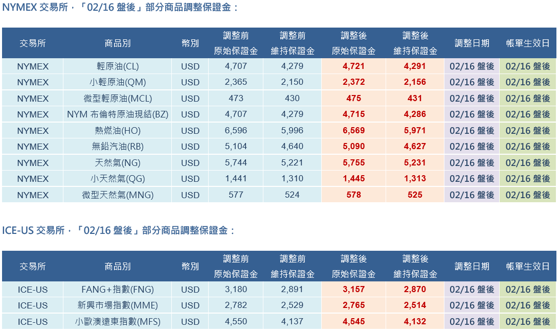 CBOT、CME、NYMEX、ICE-US、ICE-EU 交易所「02/16盤後」部分商品調整保證金