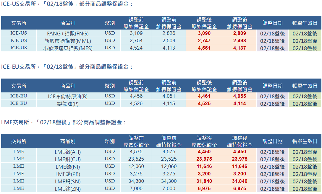 CBOT、CME、NYMEX、ICE-US、ICE-EU、LME 交易所「02/18盤後」部分商品調整保證金