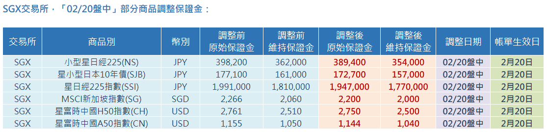 SGX交易所,「02/20盤中」部分商品調整保證金